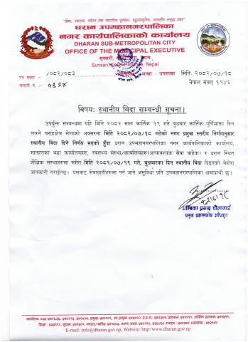 १२५ औं धरान स्थापना दिवसको अवसरमा सार्वजनिक विदा दिइएको सम्बन्धी सूचना