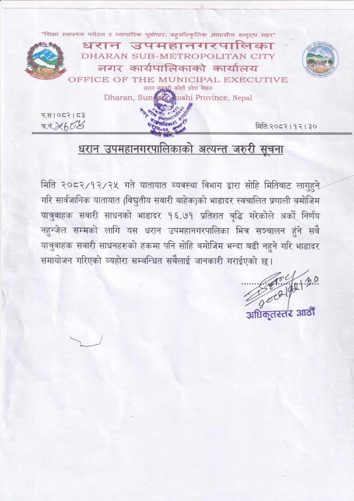 धरान उपमहानगरपालिकाको अत्यन्त जरुरी सूचना