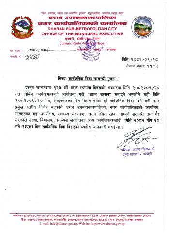 १२५ औं धरान स्थापना दिवसको अवसरमा सार्वजनिक विदा दिइएको सम्बन्धी सूचना